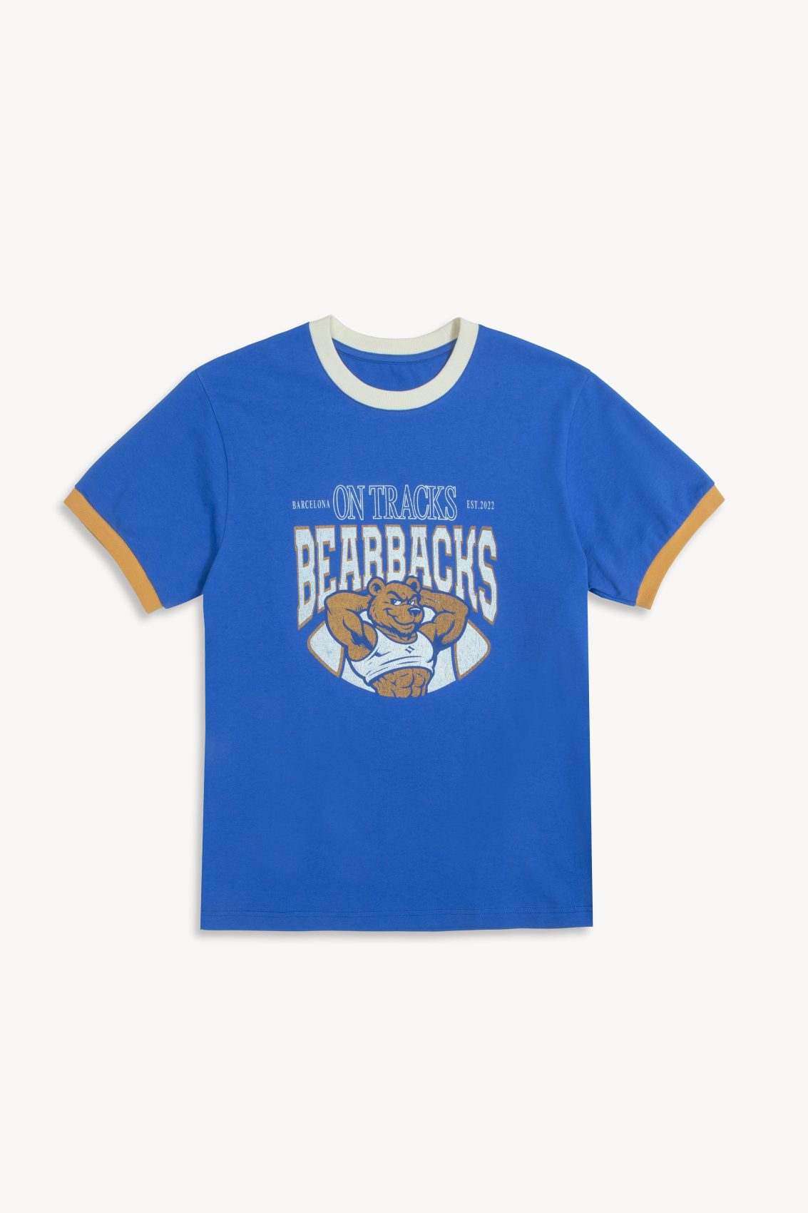 Varsity ringer tee with contrast cuffs and neckline, featuring the Bearbacks Wrestling graphic on the front. Includes a small emblem on the back and a classic athletic fit with a soft cotton feel. Built for warm-ups, team days and that vintage collegiate mood.