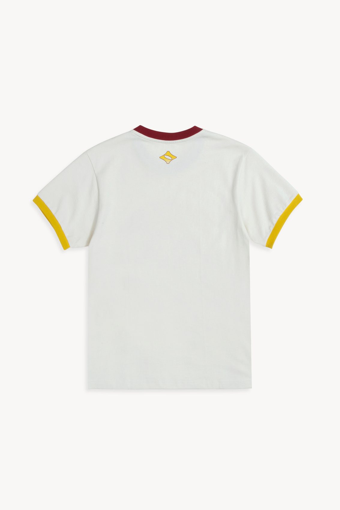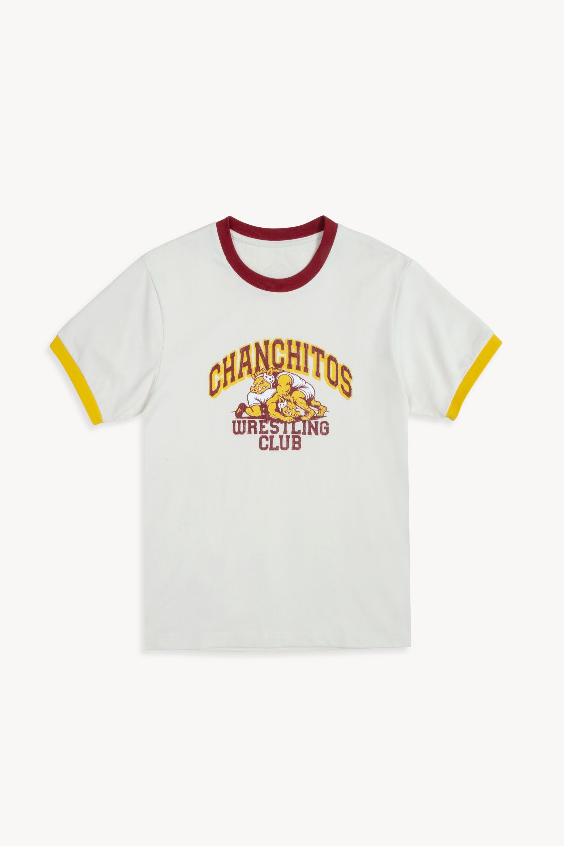 Varsity ringer tee with contrast cuffs and neckline, featuring the Chanchitos Wrestling Club graphic on the front. Includes a small emblem on the back and a classic athletic fit with a soft cotton feel. Built for warm-ups, hangouts and that retro team spirit.