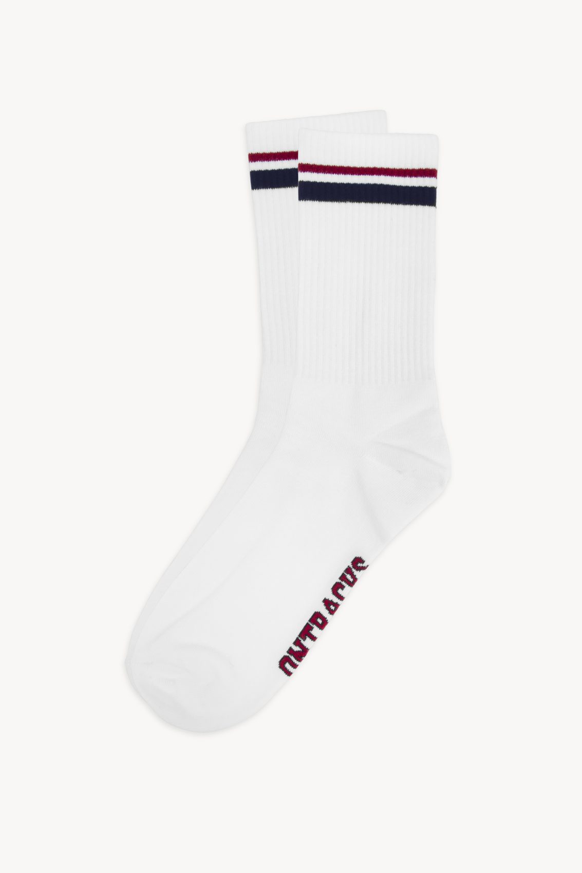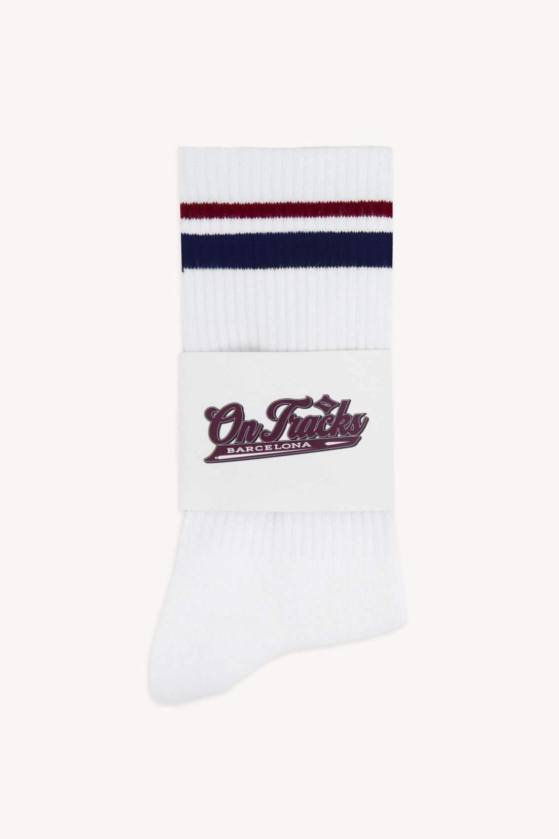 Features a ribbed design with burgundy, white, and navy stripes for a sporty, retro-inspired look.