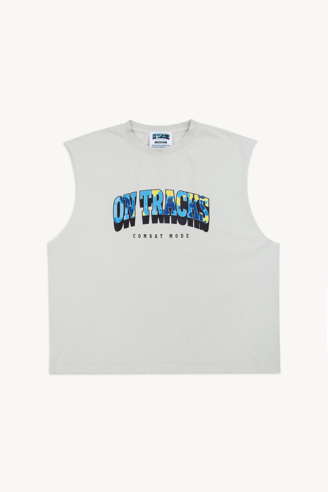 Muscle boxy tee with a camouflage ONTRACKS on the front and a camouflage logo on the back. Made in 100% cotton.