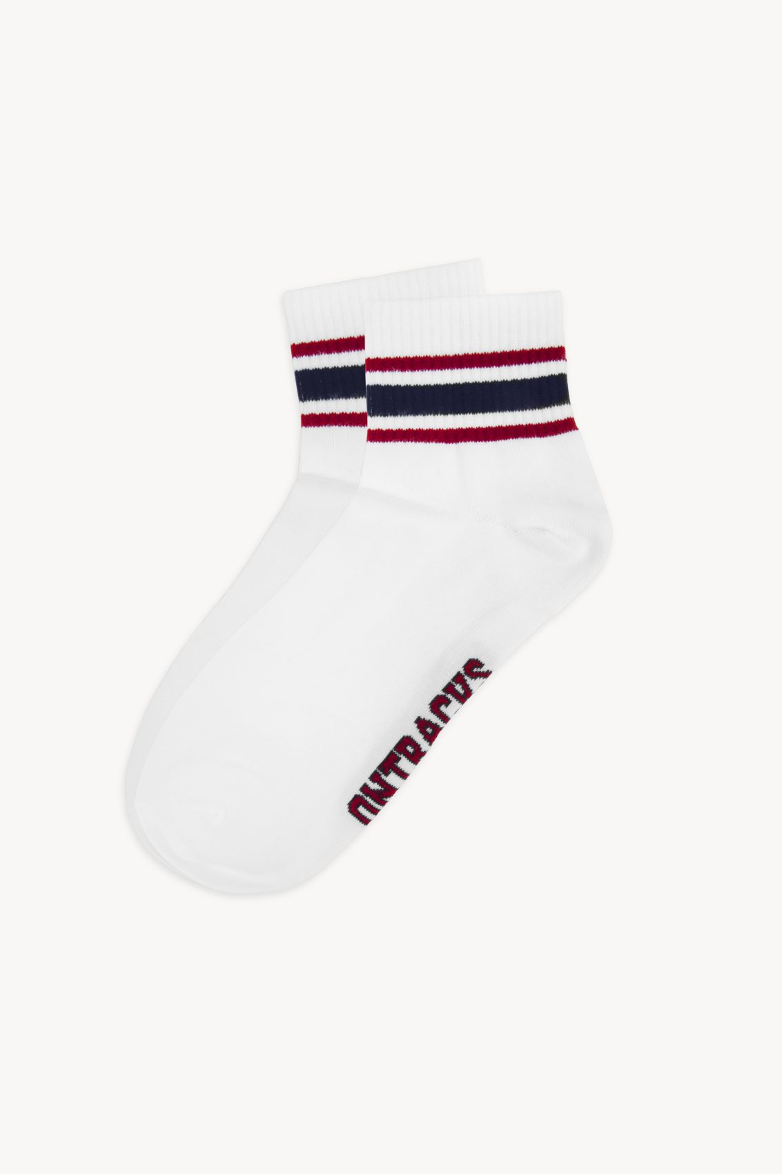 Features a ribbed design with burgundy, white, and navy stripes for a classic athletic look.